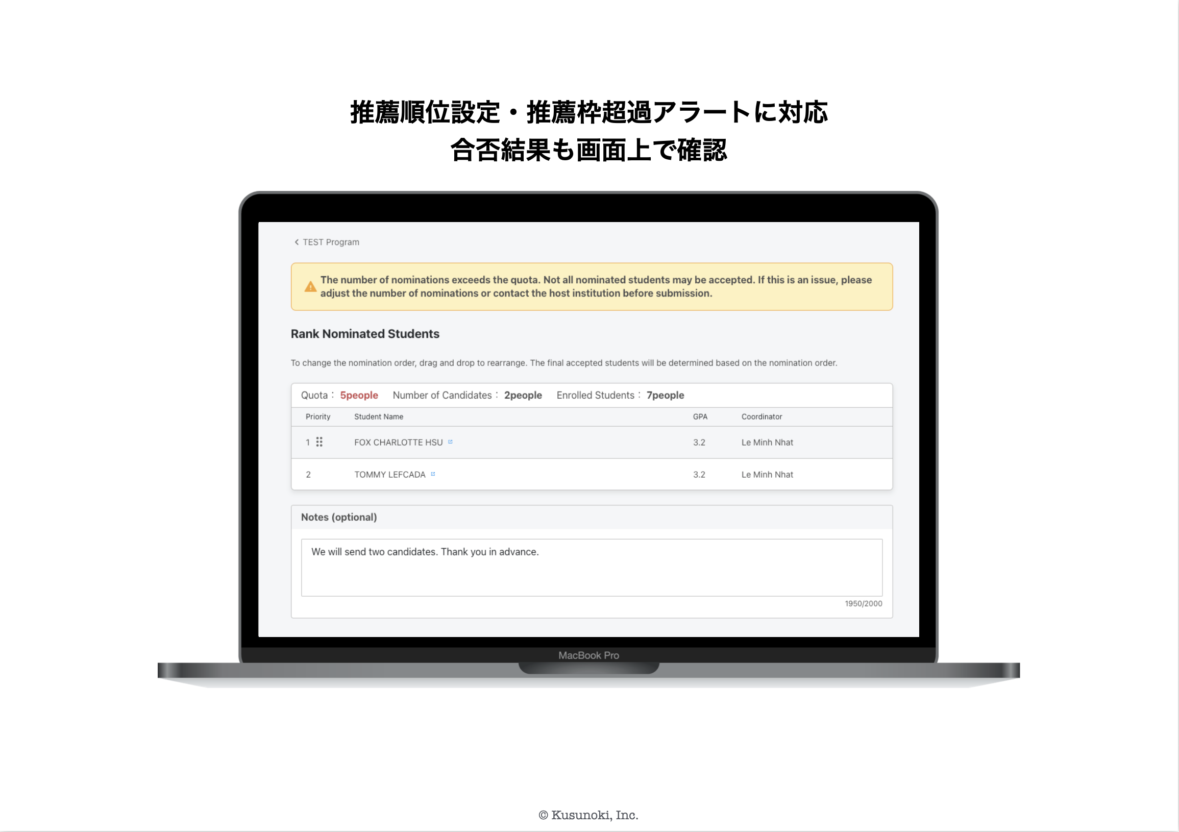 推薦する学生に対して、順位を付けられるようになりました。受入先(学校側)が優先度を把握しやすくなります。